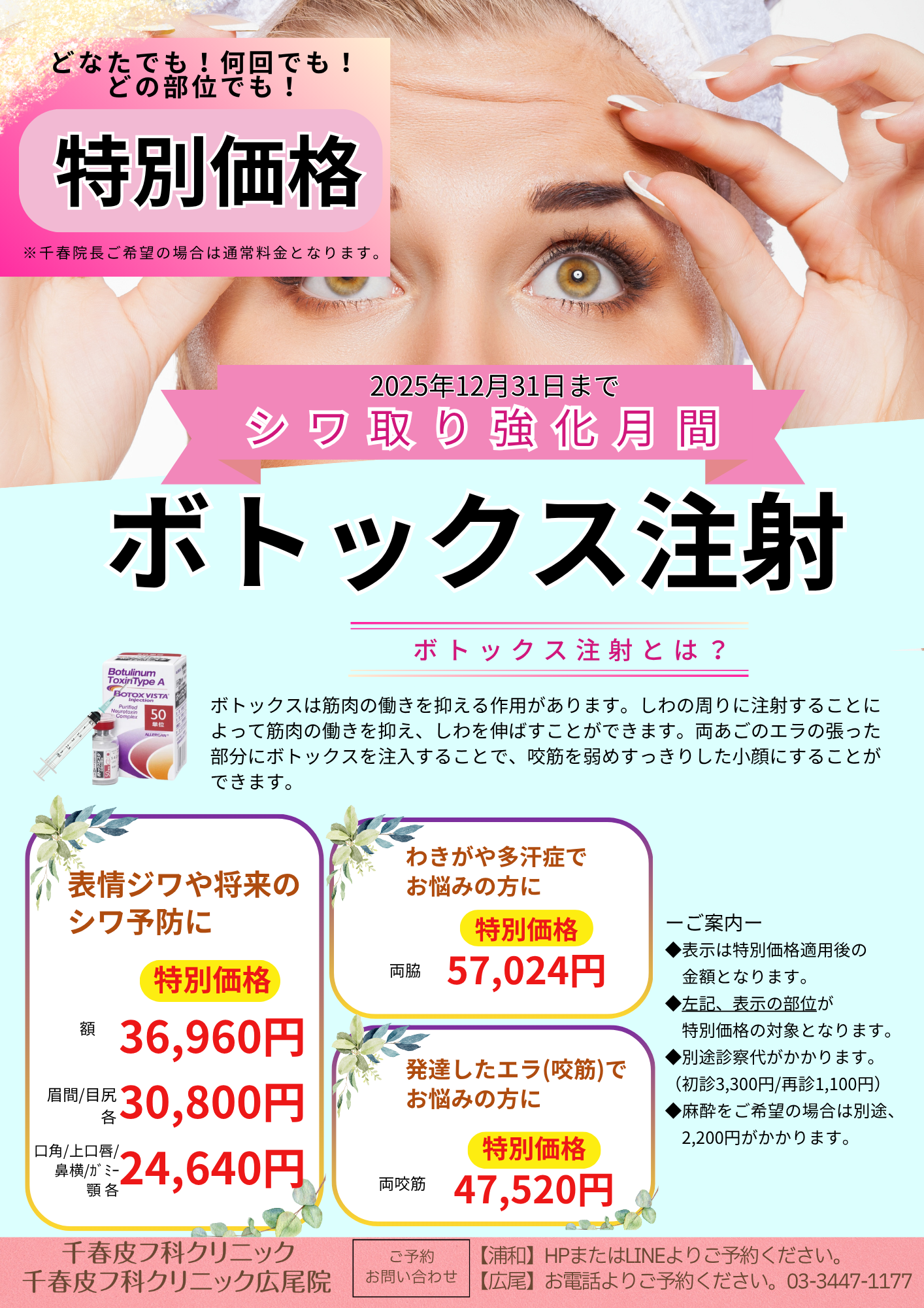 【美容皮膚科】特別価格のご案内 2025.10.25 現在美容皮膚科では以下のメニューを特別価格でご案内しております。 ■ボトックス注入:2025年12月29日(月)まで ■ショッピングスレッド ■糸リフト ■ザーフ:2025年10月31日(金)まで 詳細は下記にてご確認ください。 前のページへ戻る