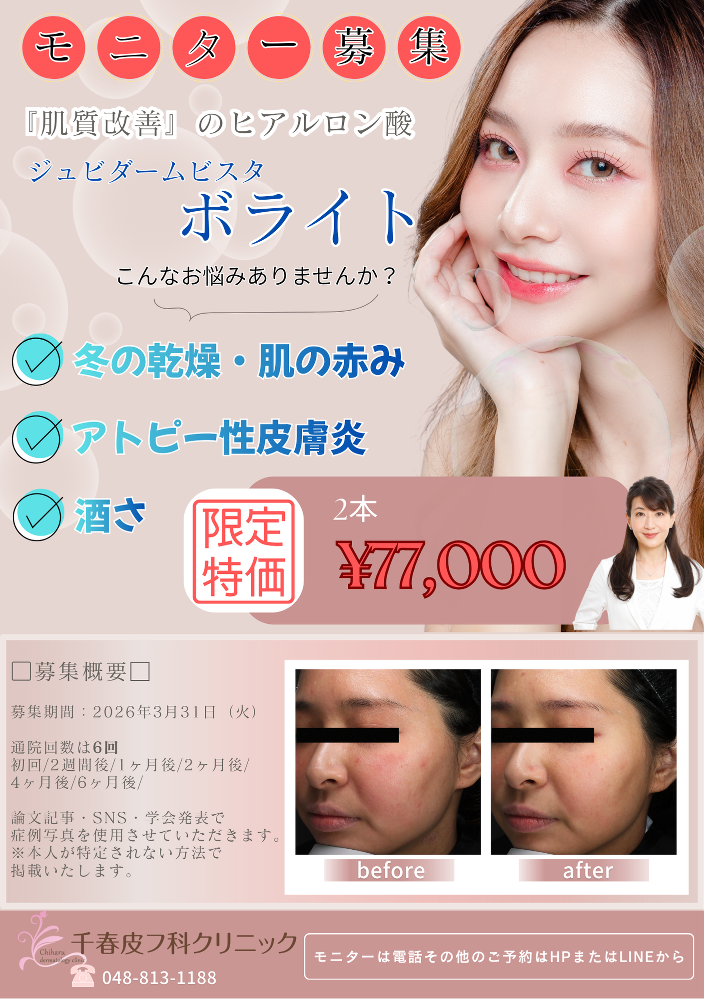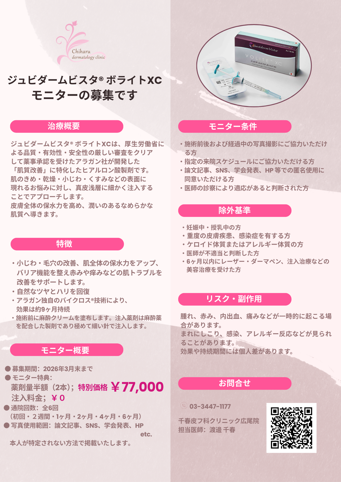 【ジュビダームビスタボライト】モニターにご協力ください 2025.11.15 ■ジュビダームビスタボライト モニターを募集しております。 募集期間:2026年3月31日まで 詳細は下記のとおりです。 前のページへ戻る
