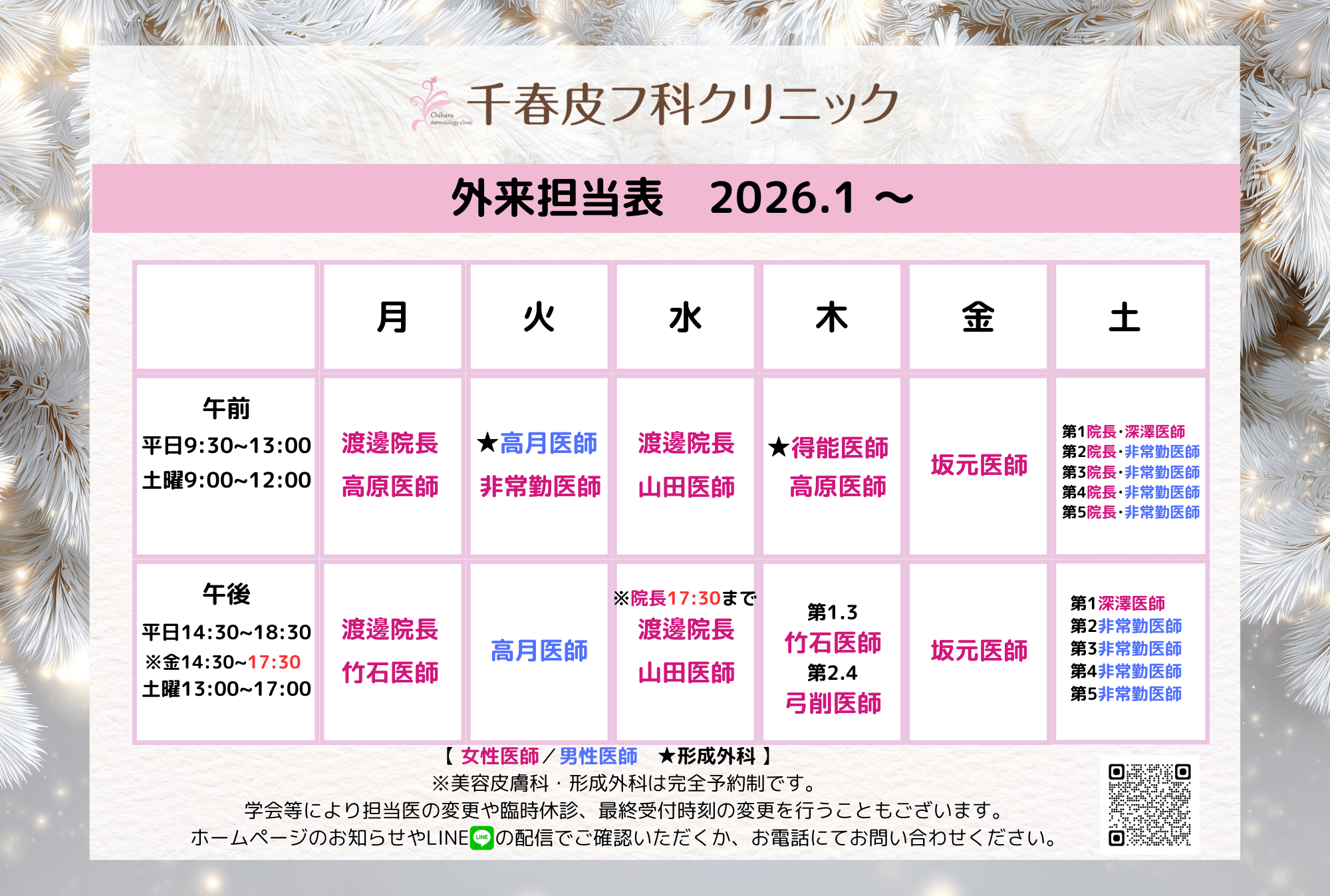 | 1/8(木) | AM得能医師(形成外科)・高原医師 | AM得能医師(皮膚科・小児皮膚科・ 美容皮膚科※形成外科休診) |
