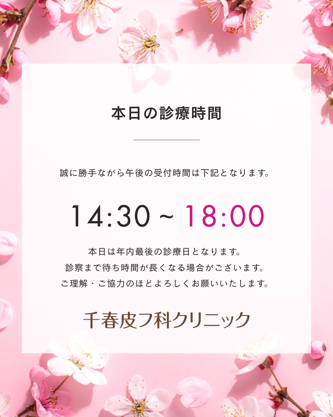 本日12/29(月)の診療時間につきまして 2025.12.29 皮膚科・小児皮膚科は予約制ではございませんので診療時間内(18:00まで)にご来院ください。 年末年始休診は、12/30(火)~1/4(日)となります。 1/5(月)より通常通り診療を行います。 前のページへ戻る